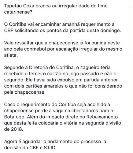 Será a primeira participação do clube na competição após 10 anos. Batalha campal no couto pereira coritiba rebaixado para 2° divisão. Nem mesmo as campanhas horríveis de vasco e joinville conseguiam superar o coxa. Hugo, matheus bueno (sarrafiore) e mattheus (nathan); Técnico em geral não gosta da classificação.